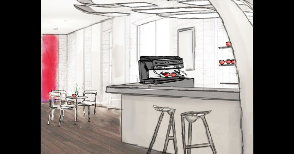 Das zentrales Objekt, hier die Espressomaschine, wird in einer dazu passend inszenierten Szene dargestellt und durch Platzierung und weitere bildgestalterische Mittel, beispielsweise durch gezielte Lichtführung, in den Fokus gerückt.