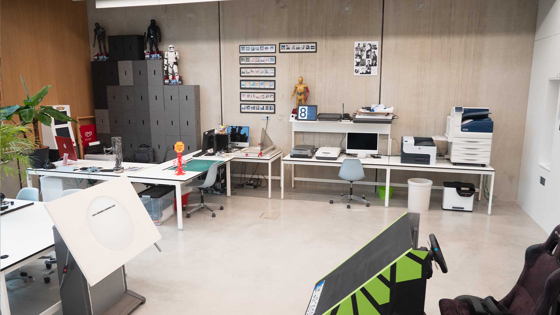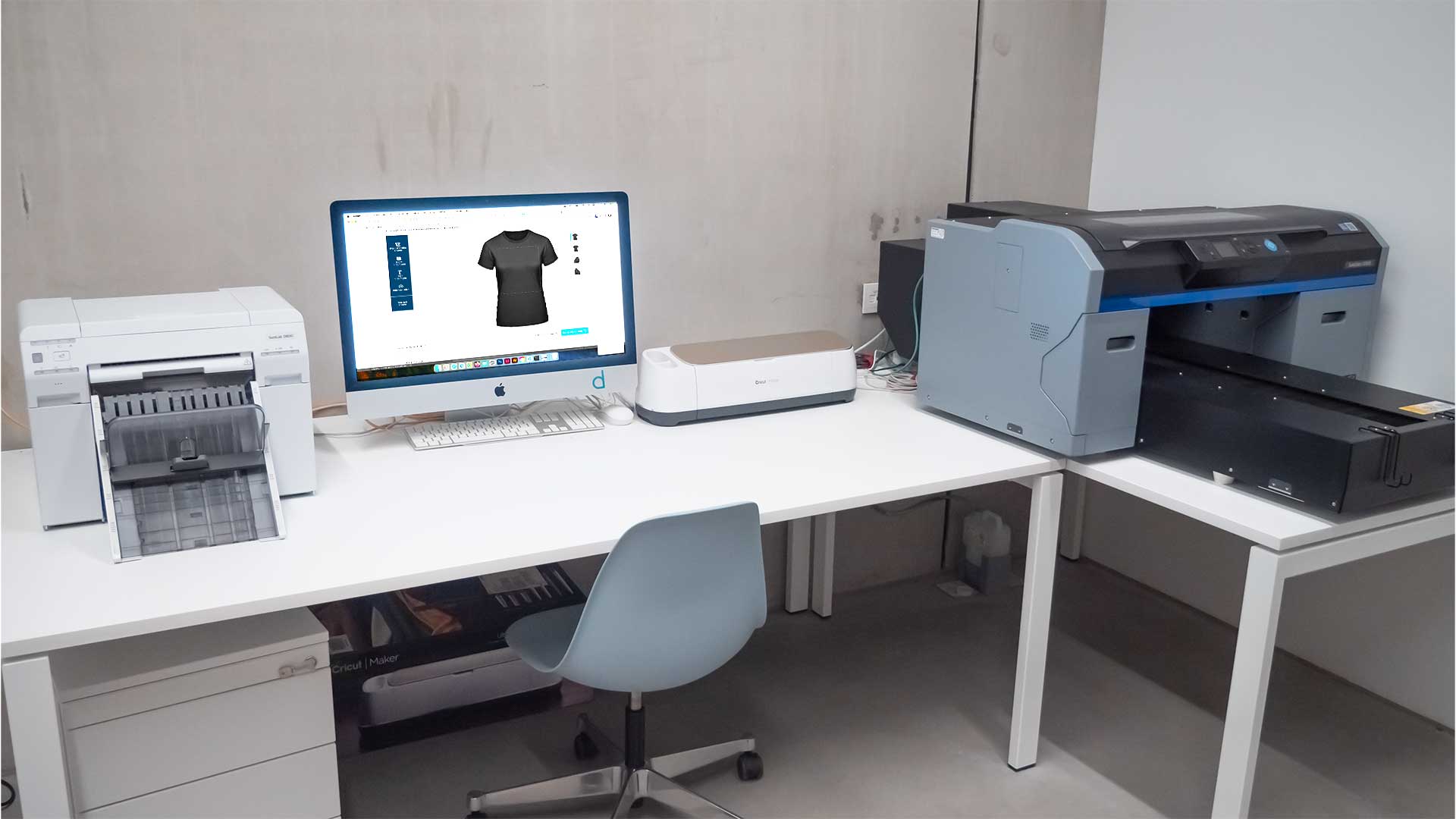 In diesem Raum wird produziert. Neben den verschiedensten 3D Druckern der neusten Generation, findet sich hier auch unsere Textildruckerei. Wir bedrucken Stoffe in folgenden Techniken: DTG, DTF, Sublimation und Flex-Transferdruck.