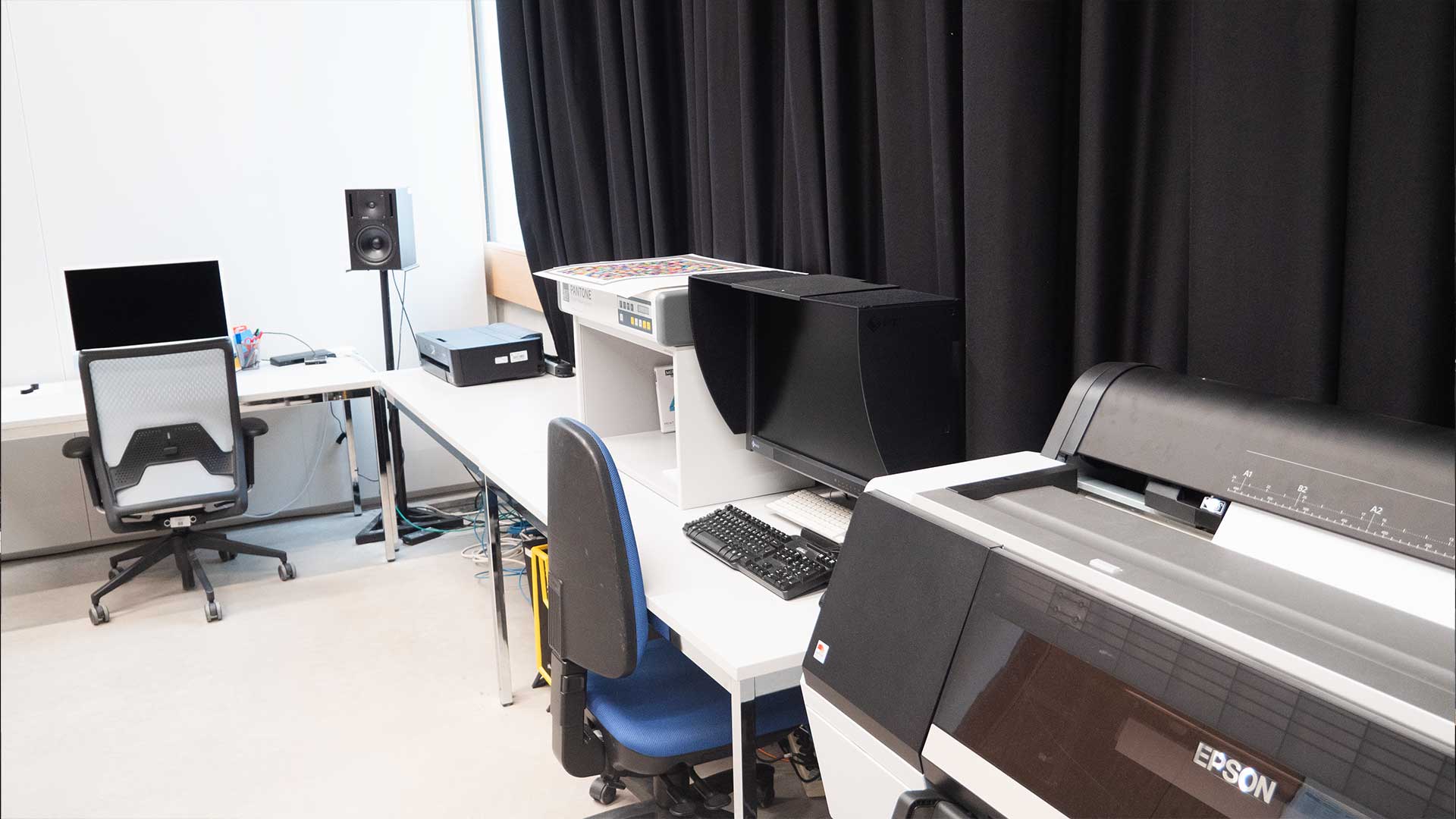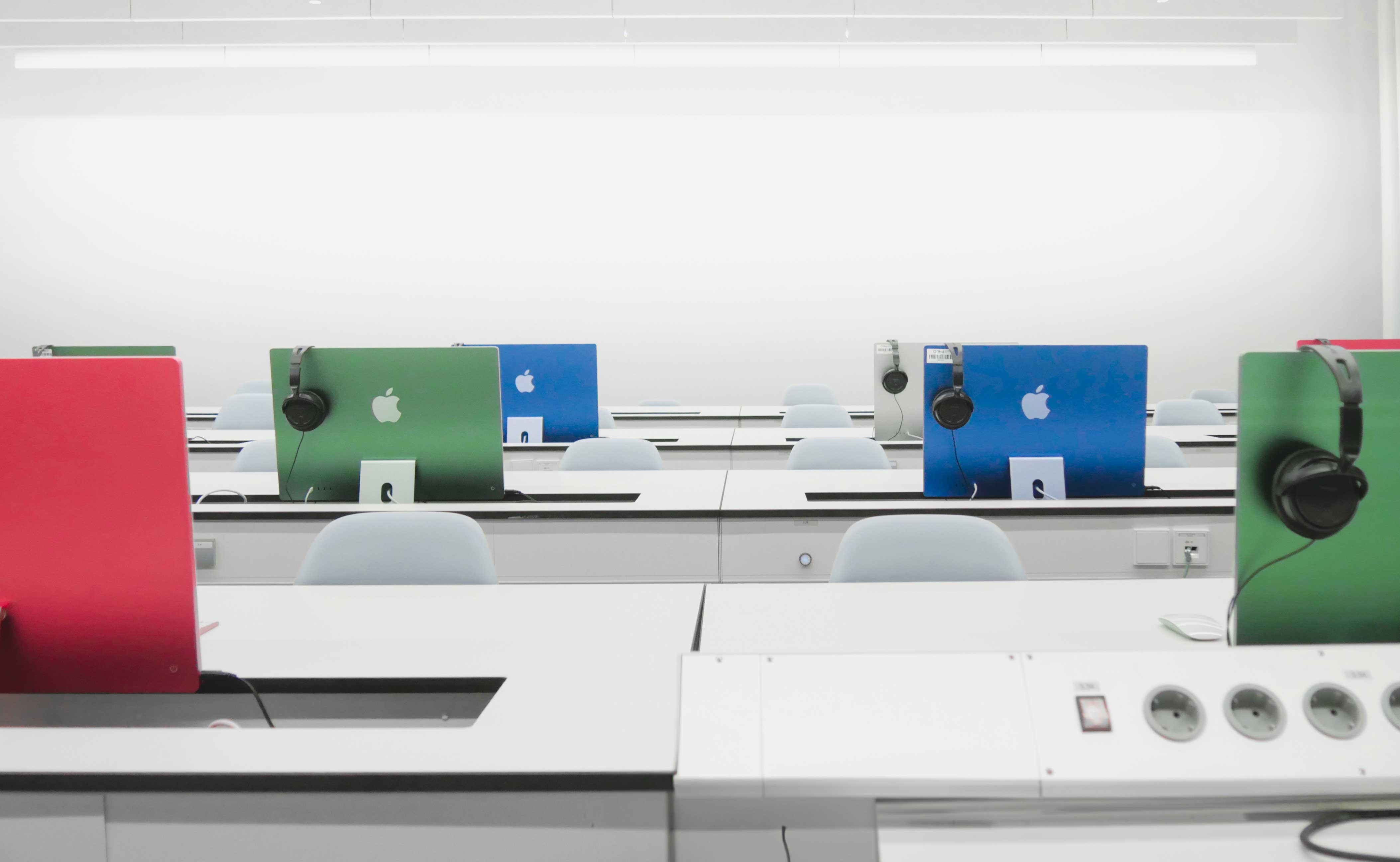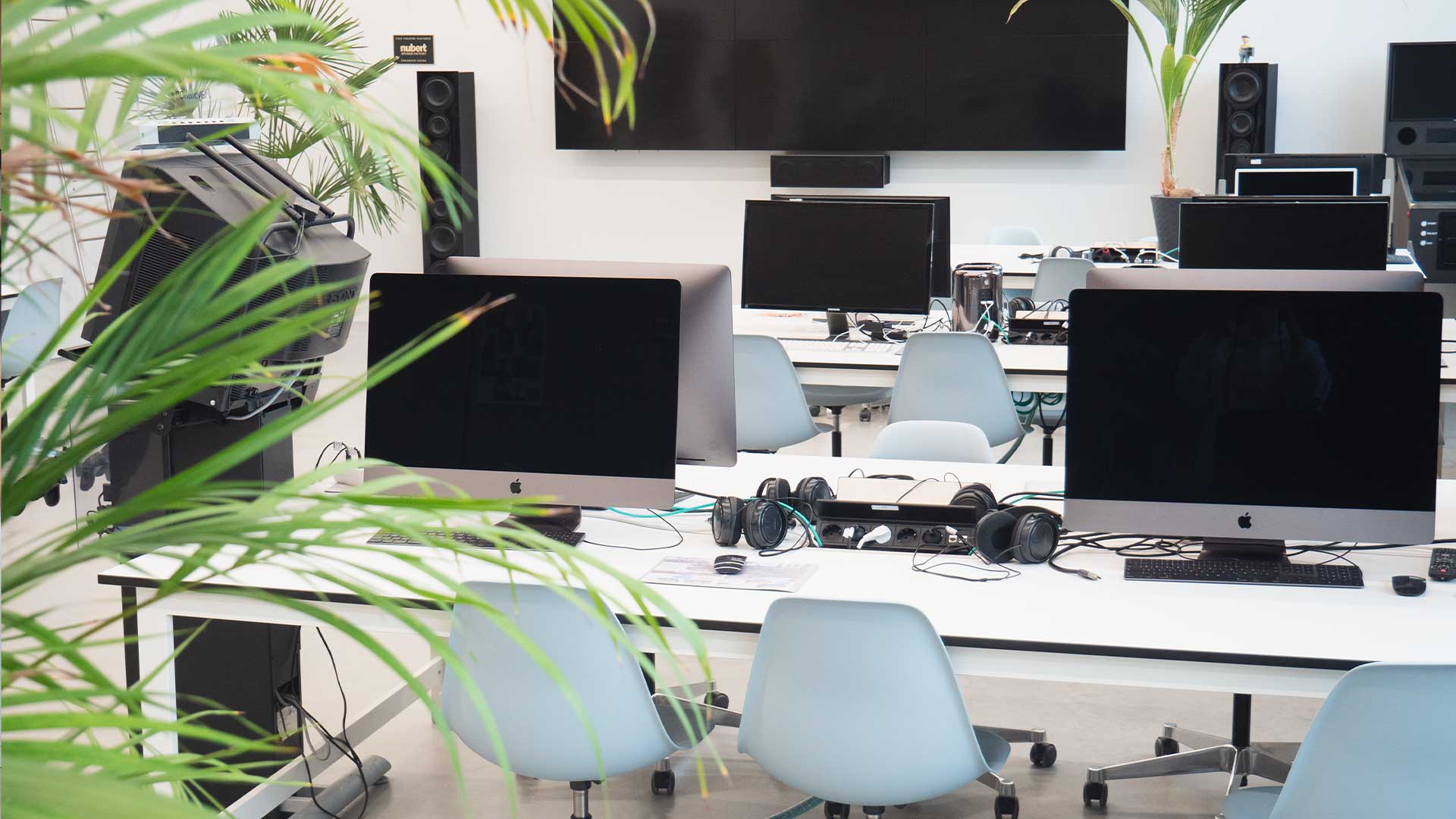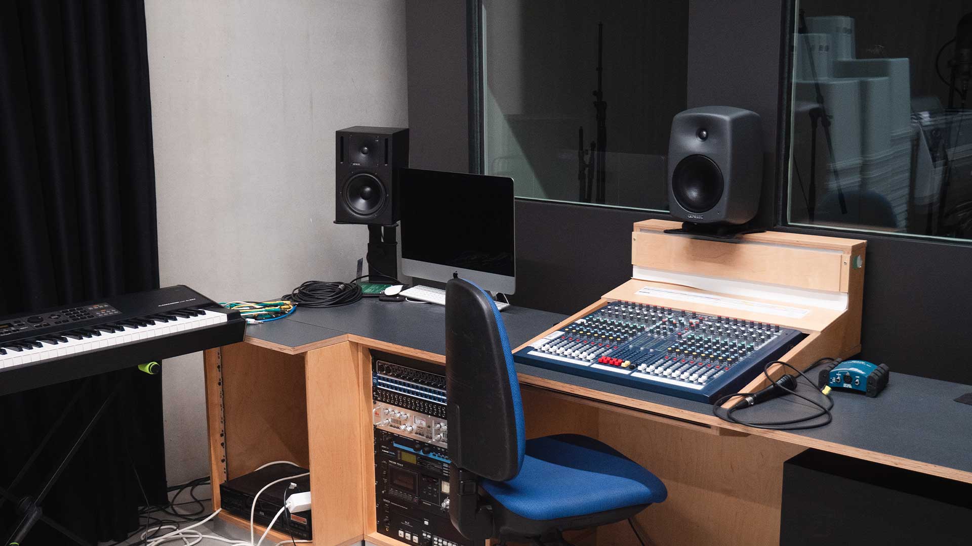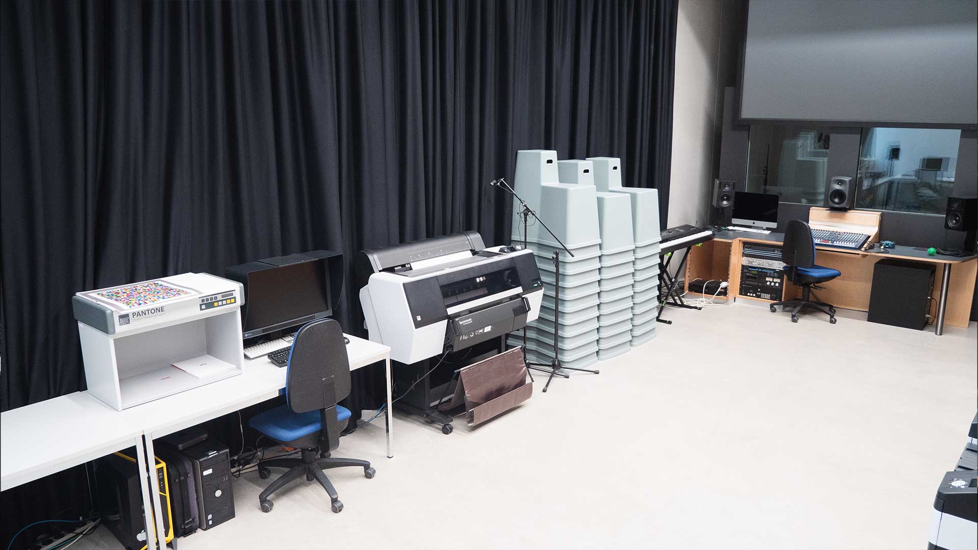Im Tonstudio können die Studierenden für ihre Projektarbeiten sowohl klassisch mit Mischpult wie auch computergestützt Audioaufnahmen erstellen und abmischen. Es steht zusätzlich eine professionelle Sprecherkabine zur Verfügung.